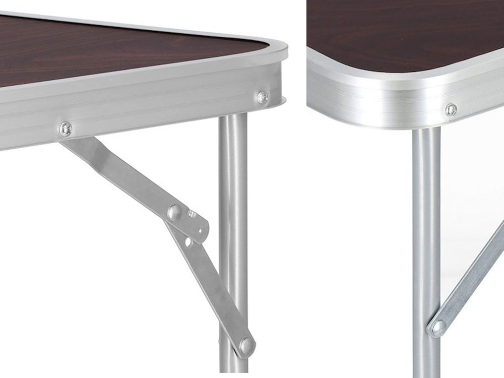 Wykonany z lekkiego aluminium i trwałej płyty laminowanej odpornej na wilgoć. Stelaż zapewnia stabilność, a łatwa w czyszczeniu powierzchnia ułatwia utrzymanie stolika w czystości nawet po intensywnym użytkowaniu w plenerze.
